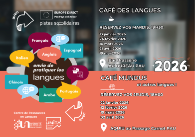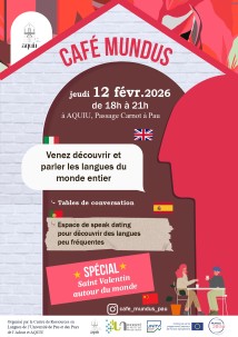 Une fois par mois, généralement le 3eme jeudi de chaque mois, l'IEFE propose à tous ses étudiants étrangers un moment de rencontre et de partage, le CAFE MUNDUS, chez AQUIU, un café-épicerie-scène de Pau, au passage Carnot, près des Halles. Cet événement est organisé par l'IEFE et par UNITA, l'alliance d'universités européennes dont fait partie l'UPPA. L'objectif est de parler et de découvrir les langues du monde : selon les personnes présentes, nous constituons des tables en anglais, en espagnol, en français, etc.