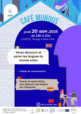 Une fois par mois, généralement le 3eme jeudi de chaque mois, l'IEFE propose à tous ses étudiants étrangers un moment de rencontre et de partage, le CAFE MUNDUS, chez AQUIU, un café-épicerie-scène de Pau, au passage Carnot, près des Halles. L'objectif est de parler et de découvrir les langues du monde : selon les personnes présentes, nous constituons des tables en anglais, en espagnol, en français, etc.